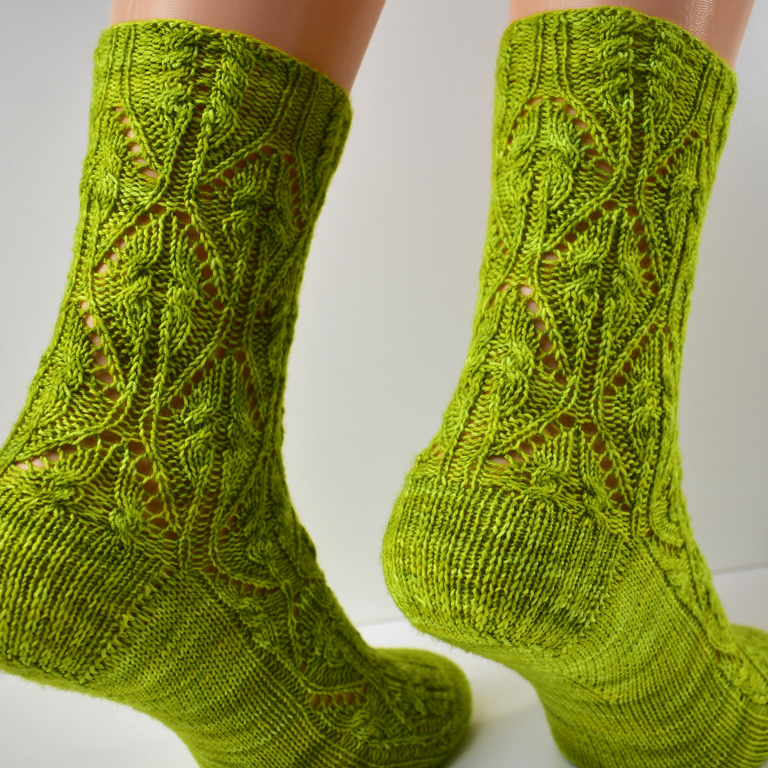 Ferngully is a cuff down sock pattern featuring lace and some simple cables. A slipped stitch heel flap and gusset decreases on the bottom of the foot give these socks a great fit. The pattern was inspired by one of my favourite movies while growing up: Ferngully, the last rainforest. The combination of the organic looking pattern and gorgeous chartreuse coloured yarn seem to capture its spirit perfectly.